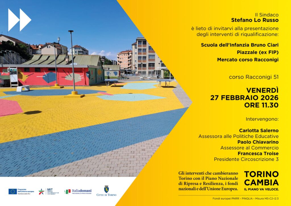 Il sindaco Stefano Lo Russo presenta i nuovi interventi di riqualificazione che interesseranno tre luoghi simbolici del territorio: la Scuola dell’Infanzia “Bruno Ciari”, l’area del Piazzale (ex FIP) e il Mercato di corso Racconigi.